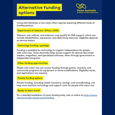 There are several other funding options available to people who have low vision or are blind. Whether you're seeking support at school, at work, or to live independently, we can help make sure that you're fully aware of any funding and benefits that you may be entitled to.